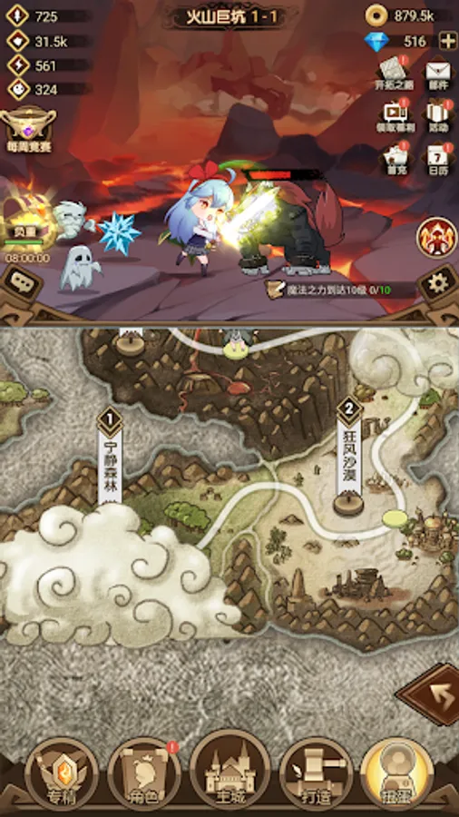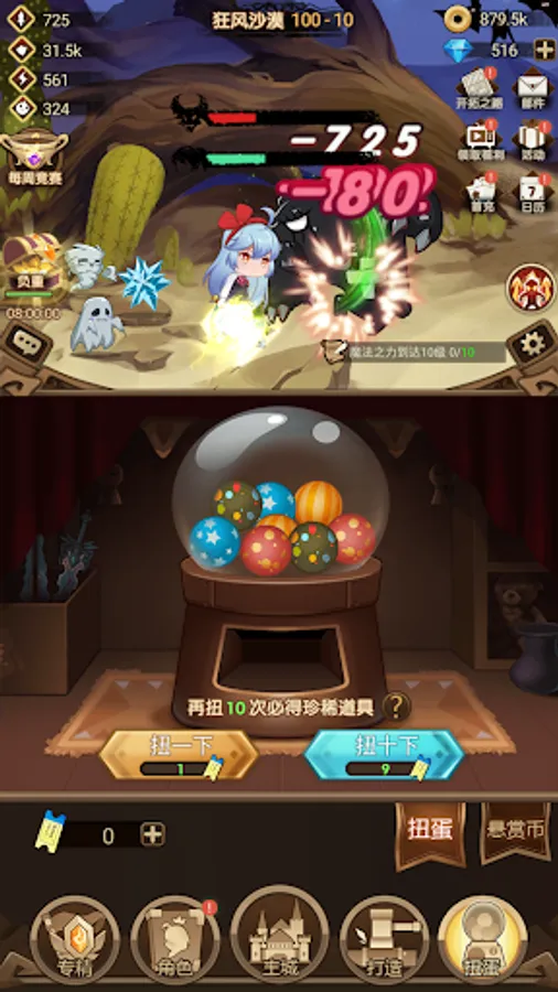The game map consists of 8 chapters. Players can rely on continuous synthesis to constantly update the protagonist’s equipment, and can unlock pets, enchants, clothing, sacred seals and other items to strengthen the protagonist and help the protagonist reach the final map: The Gate of Heaven Find a way home. The style of the game is cute and simple, with hundreds of equipment that can be matched with the protagonist. Enchantments and costumes have cool appearances that can be used to decorate and strengthen the protagonist. Dozens of Q cute pets are available for players to upgrade. And there is a magnificent main city where players need to defend and plunder other players' main city to grab resources.