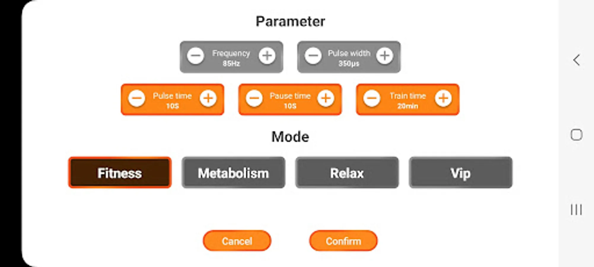 Vida Fit EMS is an application software for fitness exercise, simple registration of user information, can be quickly connected to the corresponding device use, provide control mode guidance and multi-mode selection training to meet the needs of various parts of your body exercise, help you easily exercise at home. Vida Fit EMS connects to the corresponding device through Bluetooth, can control the output of the corresponding body parts of the device, adjust the strength, and provide multi-mode training programs to provide users with different experiences