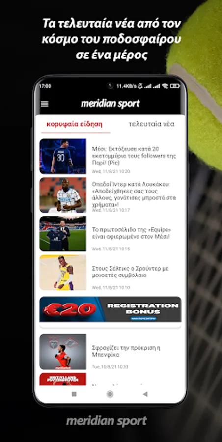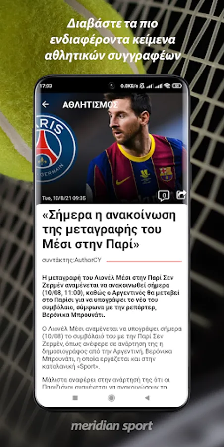 Ακολουθήστε τις τελευταίες εξελίξεις στον κόσμο του αθλητισμού και των στοιχημάτων με την εφαρμογή Meridian Sport. Αποτελέσματα, αναλύσεις εμπειρογνωμόνων, podcast και ανακοινώσεις ποδοσφαίρου, μπάσκετ, τένις και άλλων αθλητικών αγώνων σας περιμένουν.