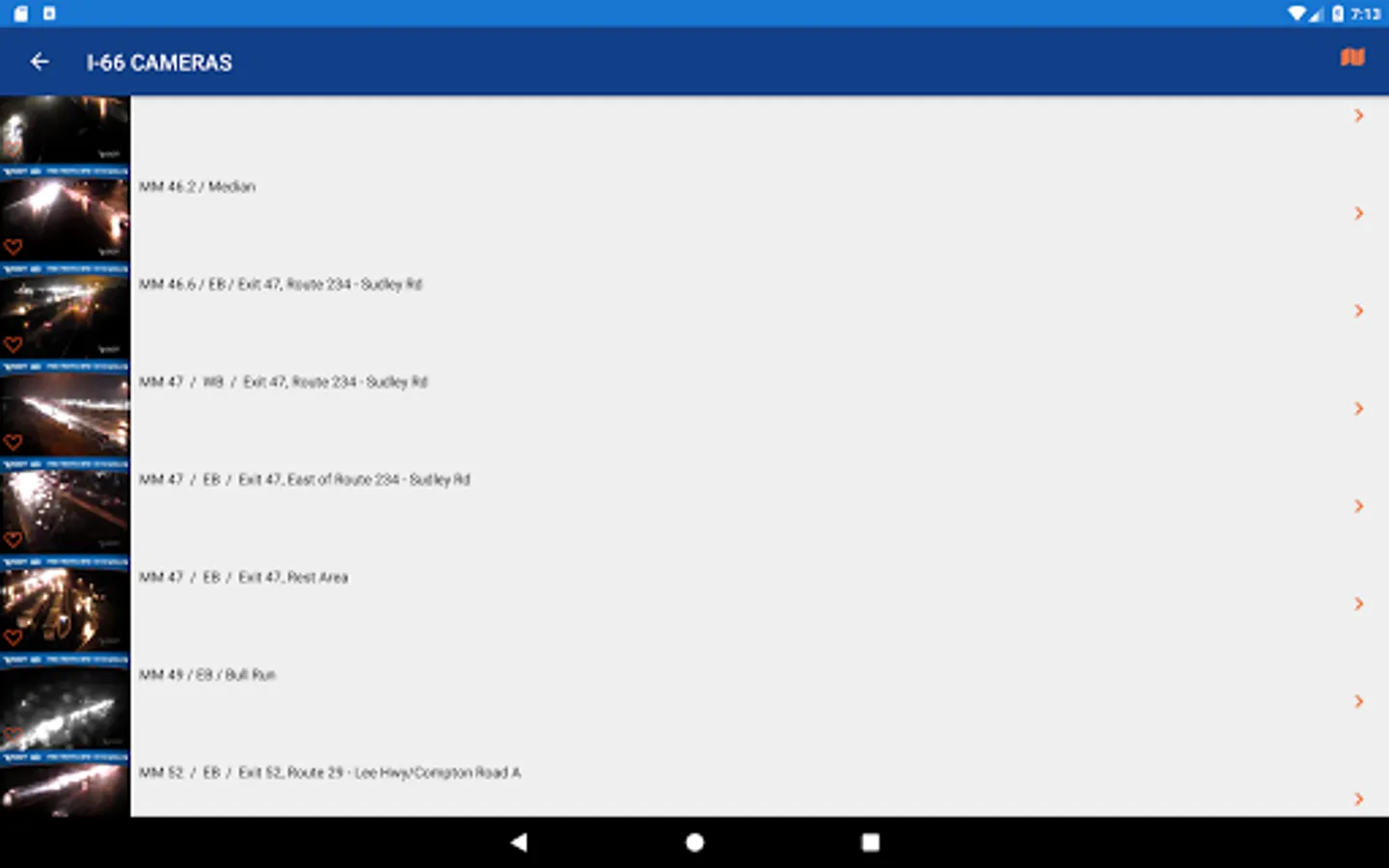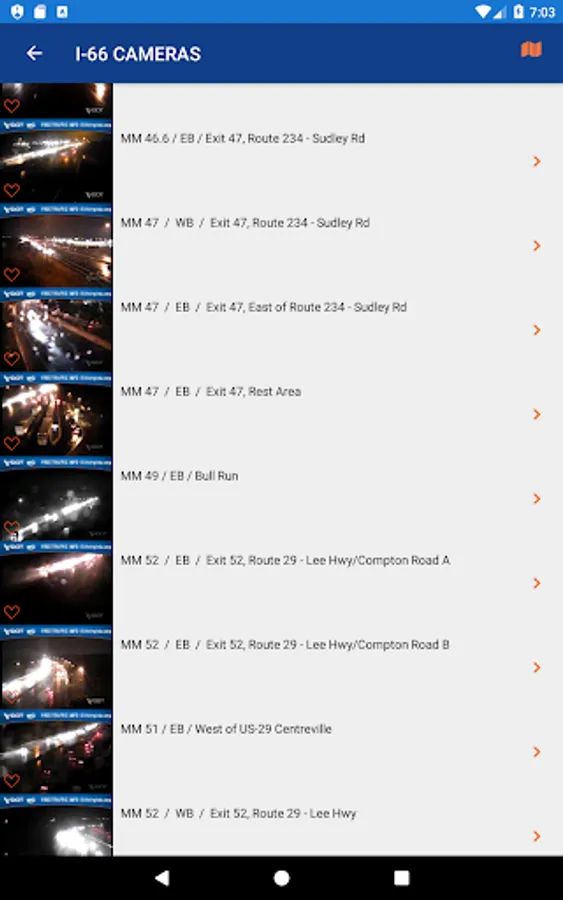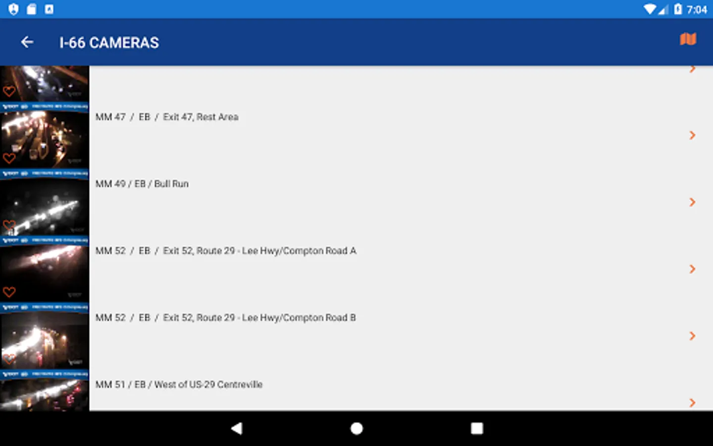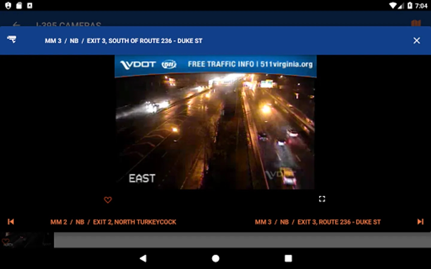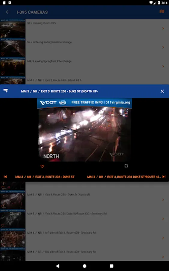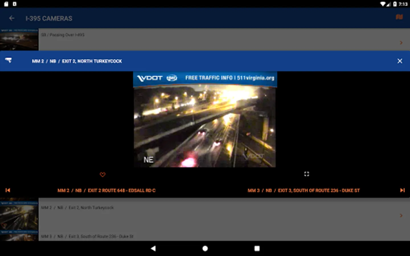 Access to VDOT cameras, incident reports, construction, bridge openings, and more is provided on the map by toggle option from the overlays menu in the upper right. Tap the pencil in this menu to re-order the Map Layers in the menu as you desire.