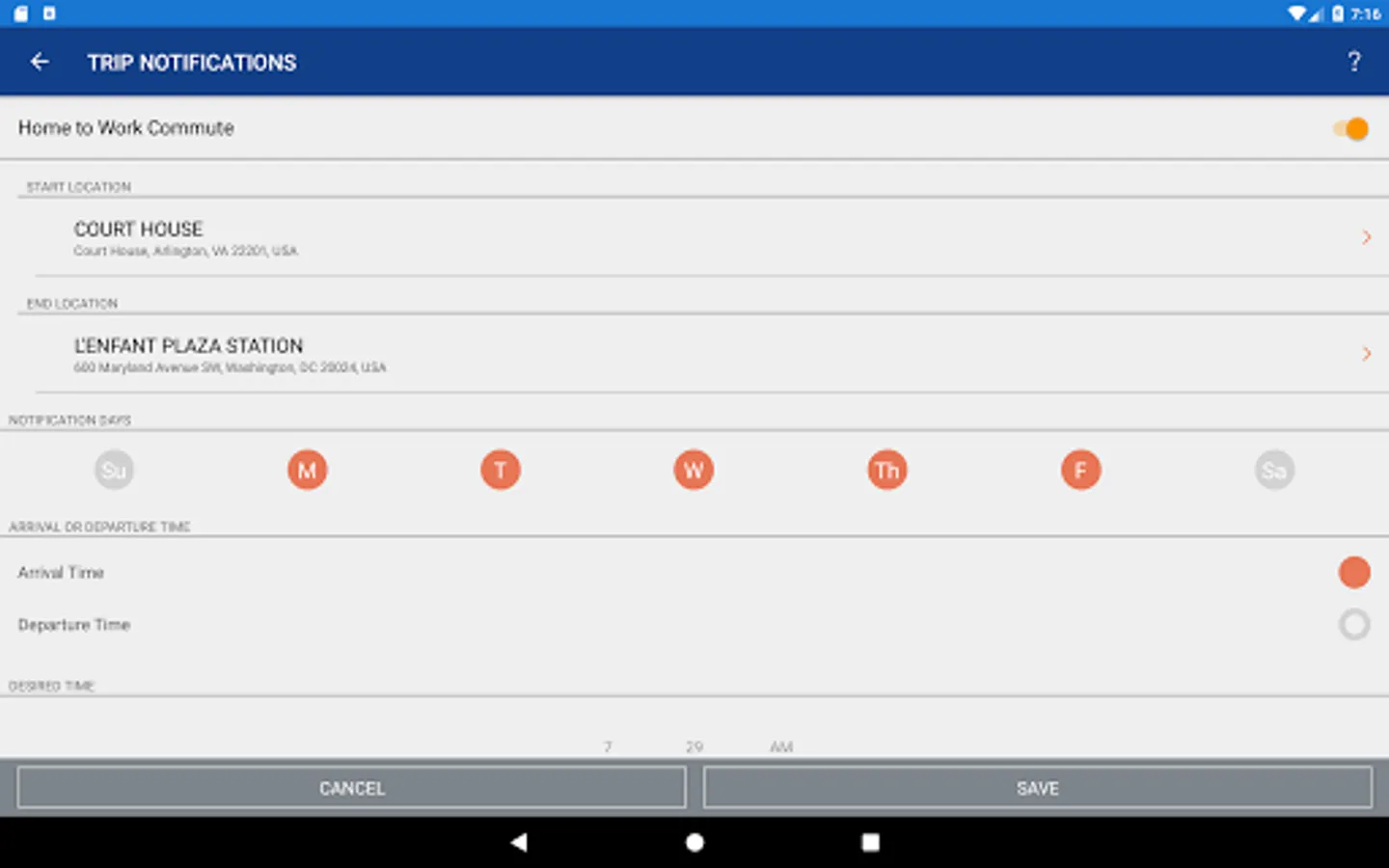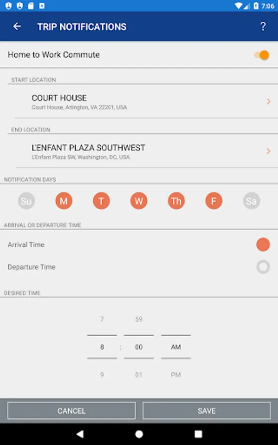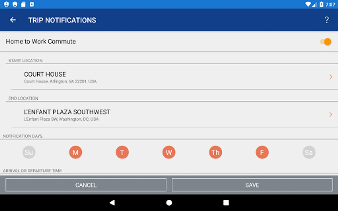 The main menu in the upper left provides access to Twitter feeds, cameras by route, travel times for predefined road segments, links to other commuter services for your area, and more. Settings can be accessed at the bottom of the main menu, and includes an option to sign up for trip notifications. Trip notifications allow you to define a recurring trip and desired arrival time, and receive a push notification in advance of the necessary departure time based upon the current traffic each day. Please note that traffic conditions can change rapidly, and travel and arrival times are a best estimate, but can never be a guarantee.