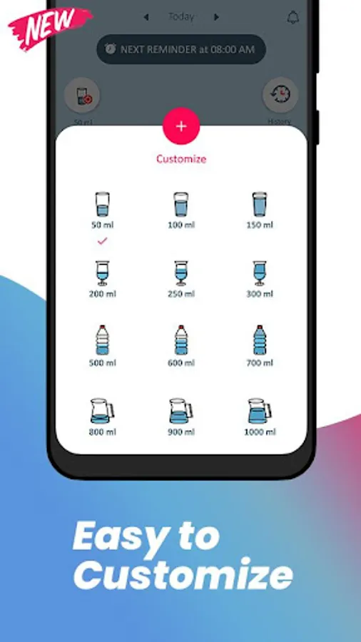 Custom Water Cup – switch the size of the water cup easily in this drink reminder.