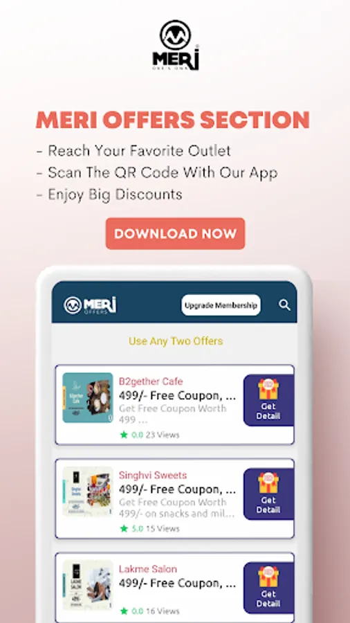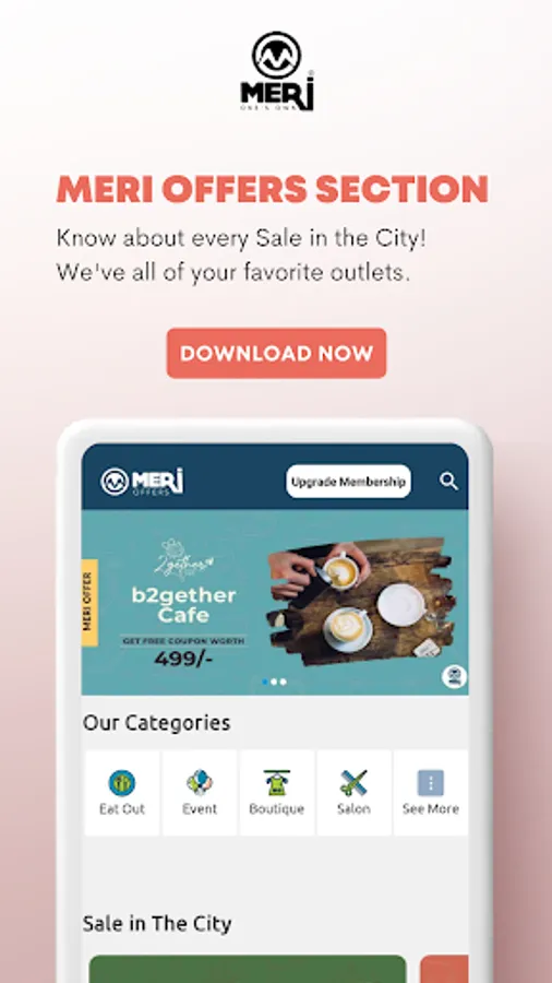 The second feature, Meri Offers, is your happiness partner which provides discounts at various outlets in the city. Meri Offers provides handsome discounts at different types of outlets- eat out, boutique, salon, sports, medical, bakery, etc.