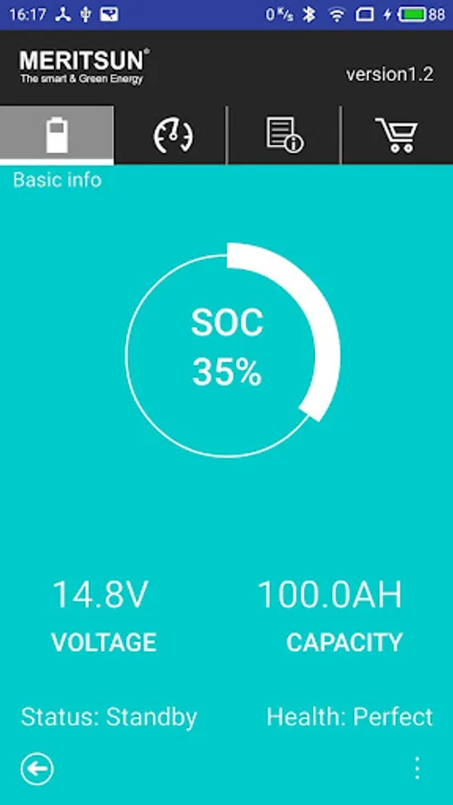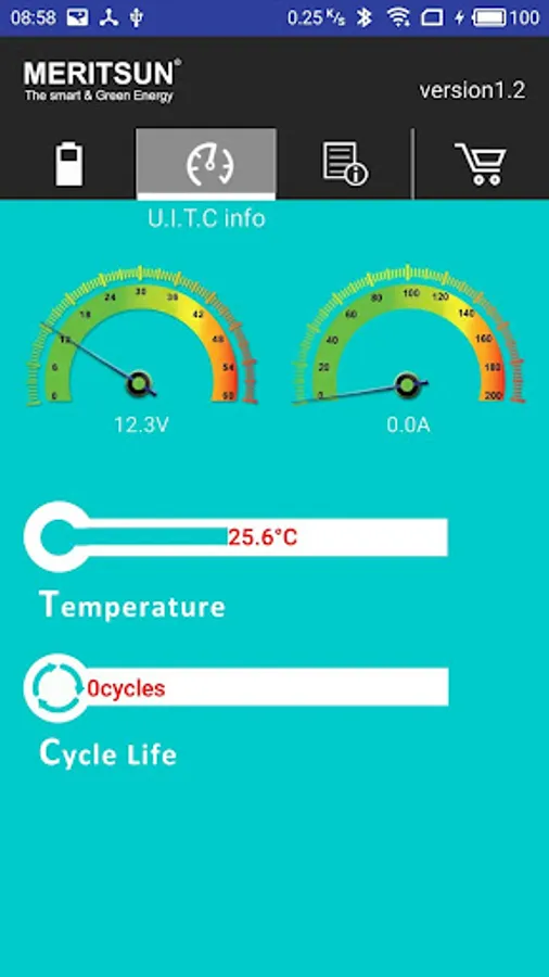 The users of MeritSun batteries can use the application to read the status of their battery. Current status, percentage of load (SOC), average amperage (incoming +/- outgoing), number of cycles since purchase, internal temperature, voltage, and alerts. The protocol used is BLE 4.0, the communication distance is on average 6 meters.