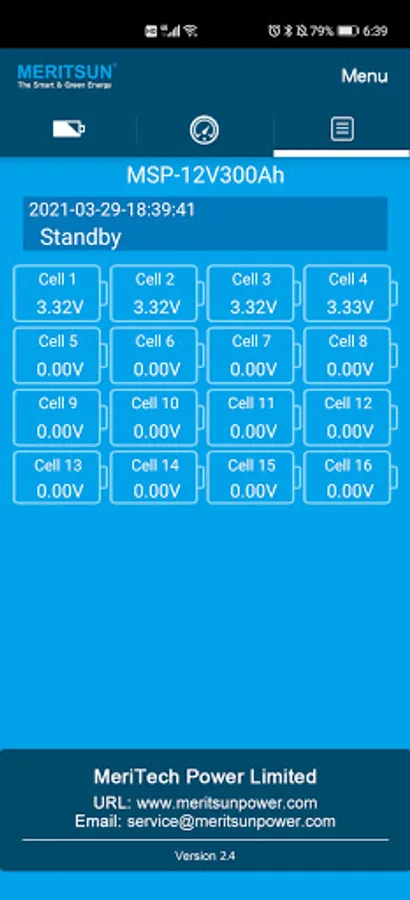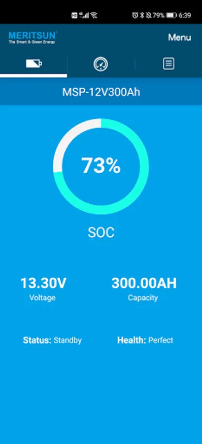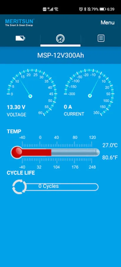 This application allows users of MERITSUN batteries to read the status of their battery. Current status, percentage of load (SOC), average amperage (incoming +/- outgoing), number of cycles since purchase, internal temperature, voltage, and alerts. The protocol used is BLE 4.0, the communication distance is on average 6 meters.