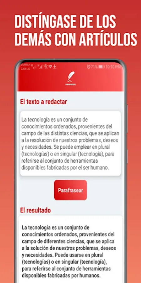 Have you ever found yourself needing to rewrite a text but found it difficult to find the right words? Do not care anymore! With the Parafrasea application, you can effortlessly obtain paraphrased versions of your texts in Spanish.