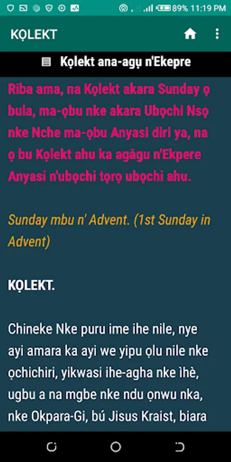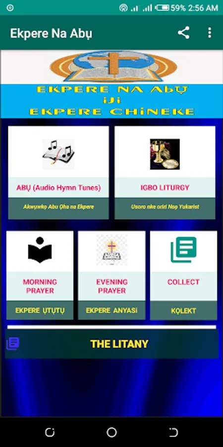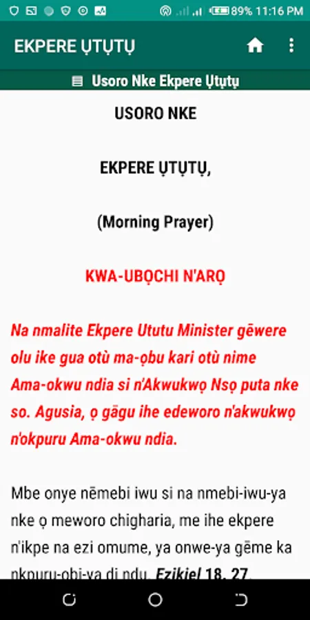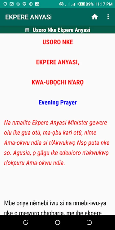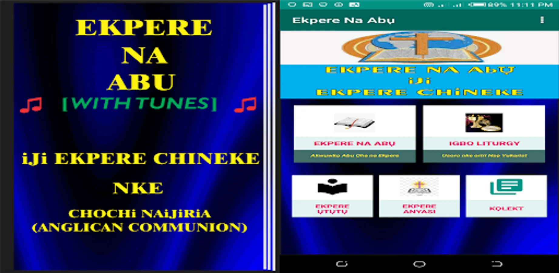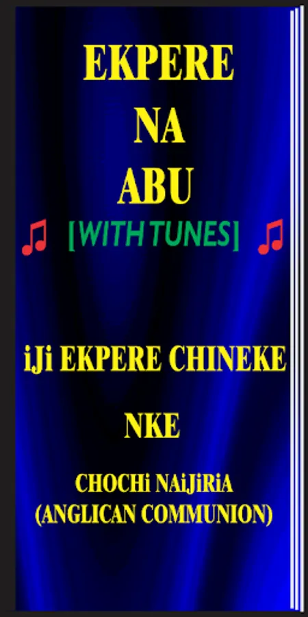 Ekpere-Na-Abụ is an Igbo hymnal with offline tunes which includes Anglican book of Common Prayers. The Abụ(hymnal) part of this book has the best and fastest search query with which you can search either by hymn title or hymn number. It also has the best first key hymnal tunes. This book is complete for use in Anglican Communion services and prayers. The text used here is the current translation, called Igbo Union, of the 1662 BCP. It was first published around 1945, but with several earlier components. Igbo language includes a number of diacritical marks, including notably vowel macrons and an 'o' with a dot underneath etc. Since Igbo language is yet to have complete Unicode we rendered the available texts.
