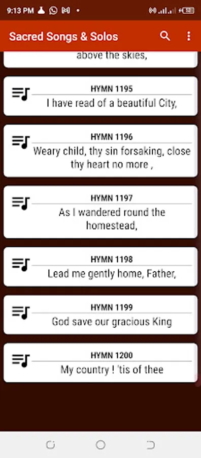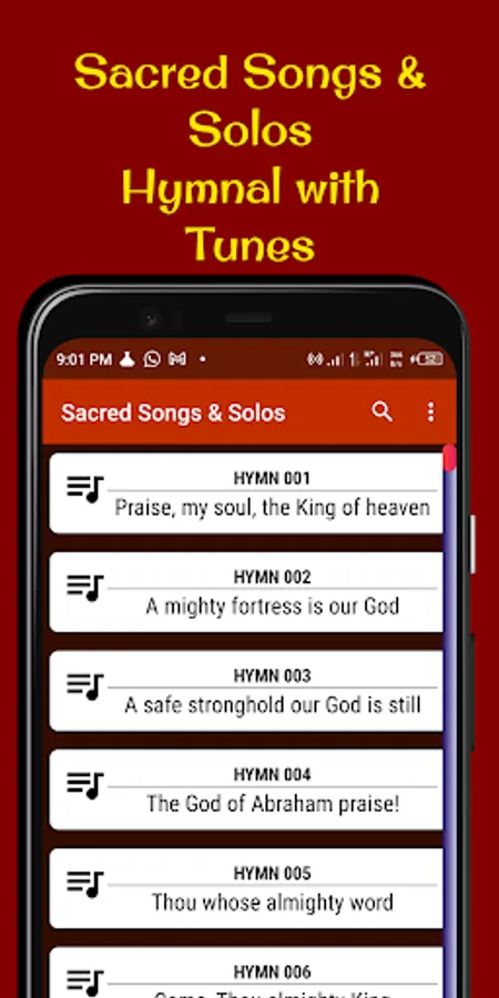 SS&S is a hymn lyrics and tune based application containing 1200 hymns which has fastest search bar with which you can search either the hymn title or number. The hymnal is accompanied with first tunes so as to enable our Christian faithful remember how the hymn is sung.