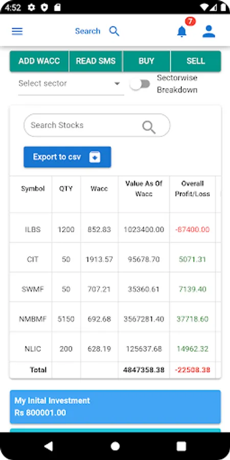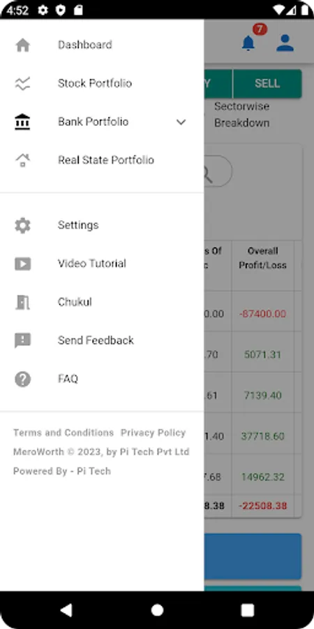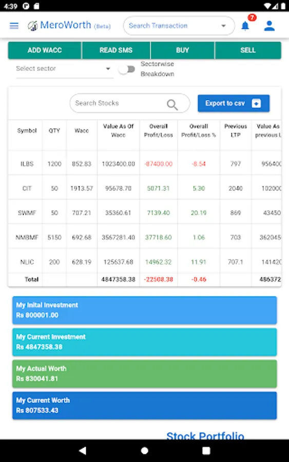 Meroworth has the capability to automatically read SMS messages related to stock transactions and update the user's portfolio accordingly. This eliminates the need for manual data entry and ensures that the user's portfolio is always up-to-date. Once the SMS is received, Meroworth performs the necessary calculations and provides the user with an updated overview of their portfolio, including today's gain, actual investment, a portfolio worth, and more. The application collects information about the user's investments in stocks, real estate, and bank portfolios, and automatically calculates the value of each investment based on current market conditions and prices. This helps users to stay informed about the performance of their investments and make informed financial decisions.