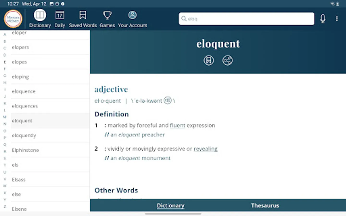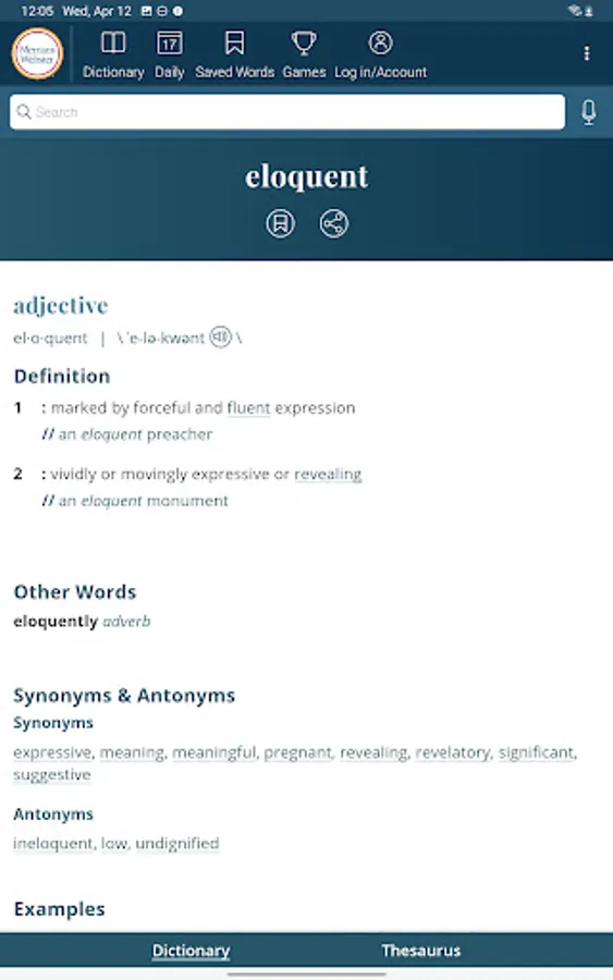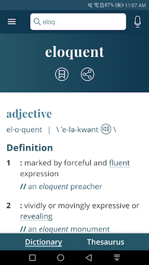 Offline access: You’ll have complete access to definitions and synonyms whether or not you’re connected. You will need a connection to view illustrations, hear audio pronunciations, and use voice search.
