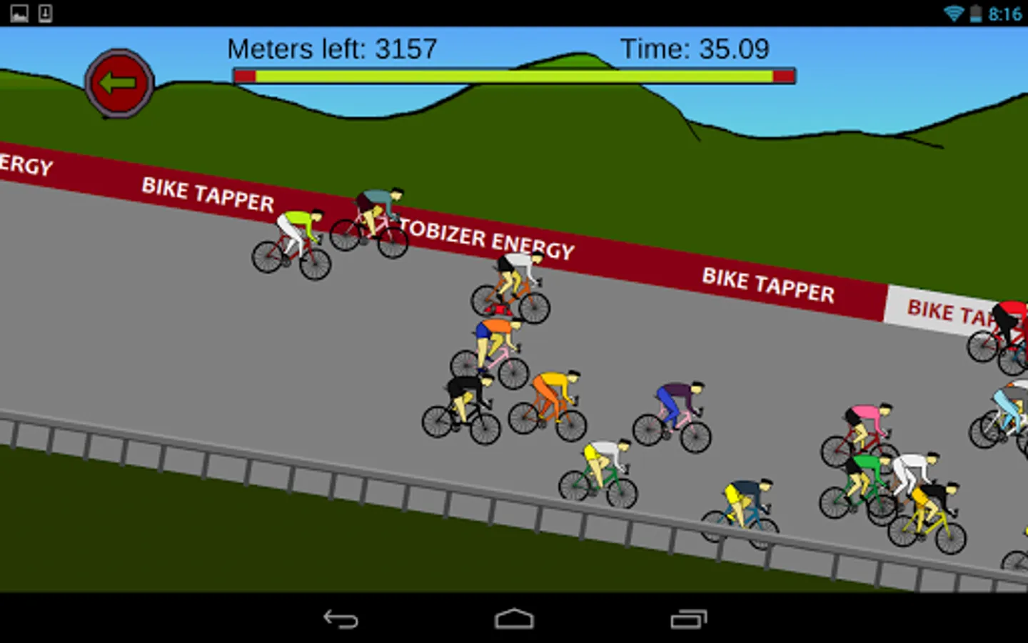 You can ride faster by simply tapping the screen. When you stop tapping energy will slowly restore. It is important to always use other cyclists to block the wind in order to not waste energy. Energy is restored slowly, but if you let your energy drop too much you will be in trouble. Make sure you have enough energy to finish the bicycle race.