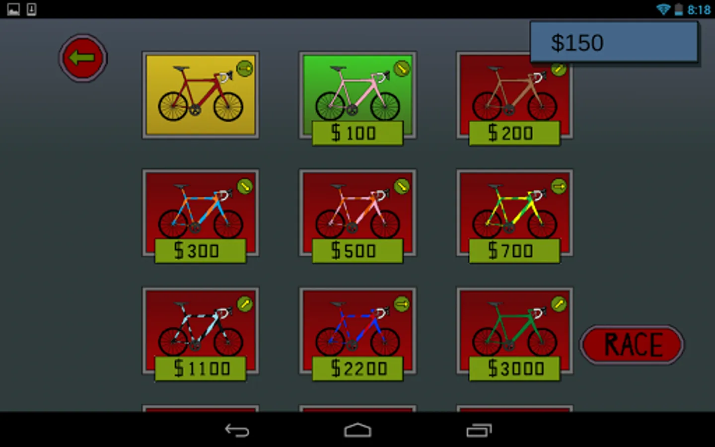 There are 27 different bikes of several different colors which can be purchased with prize money. Each bike has its specialty such as Uphill, Sprinting, and Downhill. Usually the more expensive the bike is the faster it will be. However, computer cyclists will bike faster and faster as you pass each level. Be sure to find a good balance. You need an Uphill bike for races that are uphill and Downhill bikes for races that are downhill. Be sure to choose the best bike for each race and don't forget to save up for better bikes.