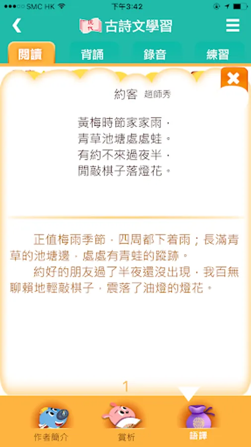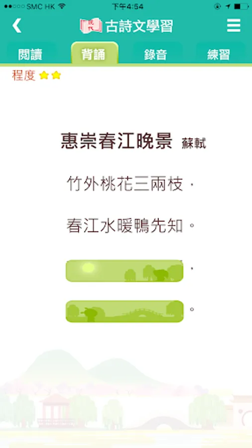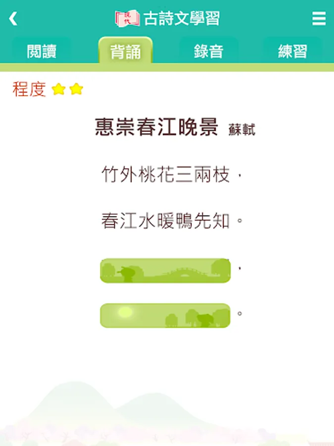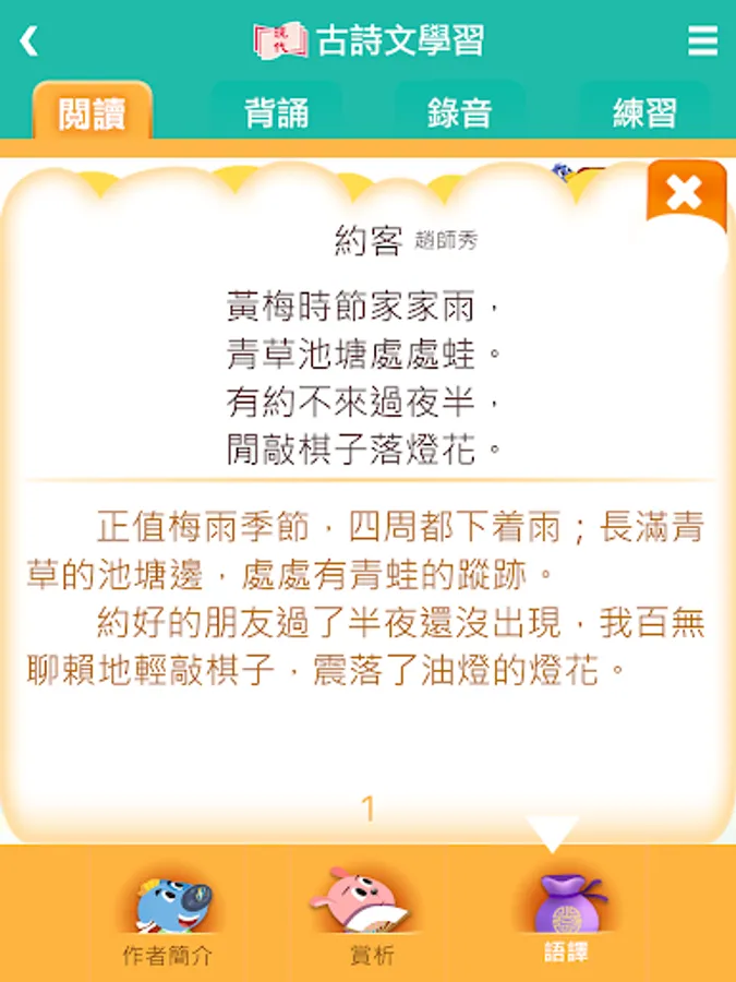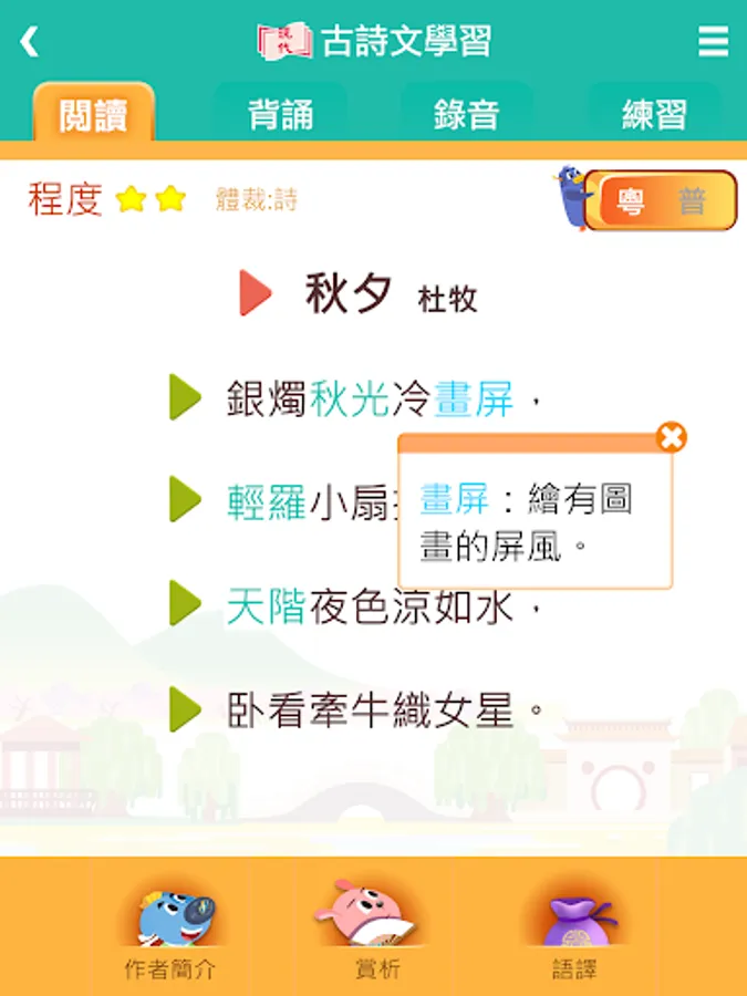 每篇古詩文均提供粵語及普通話朗讀,讓學生可仿讀古詩文。