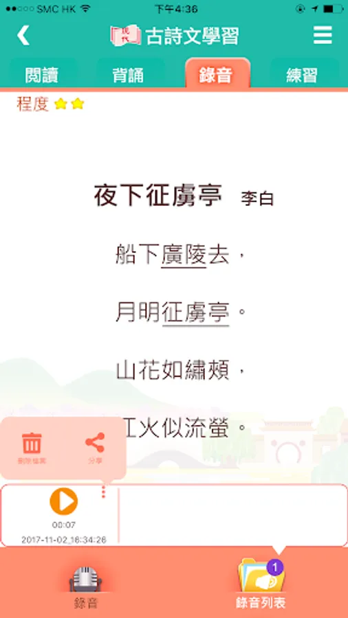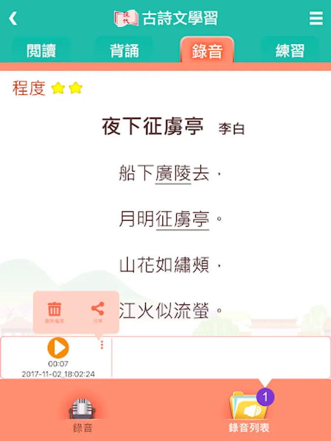 選單中會顯示已完成錄音及練習的古詩文,方便學生掌握自學進度。古詩文的錄音可通過「分享」功能傳送給家長、老師或同學。