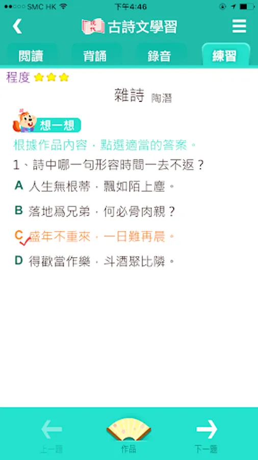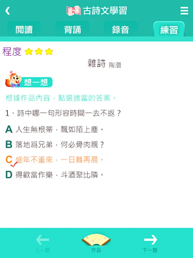 提供淺、中、深三種程度古詩文,學生可循序漸進學習,當中包括古詩及古文學習。