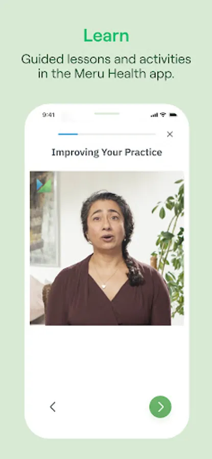 The Meru Health app enhances your care experience with guided, evidence-based lessons and activities that you can do on your own or with support of your therapist or coach.