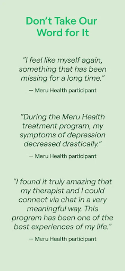 Meru Health is mental health care with continuous support from a licensed therapist, via both video calls and unlimited in-app chat. Mental health doesn’t wait for the calendar—neither should your mental health care.