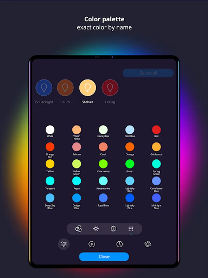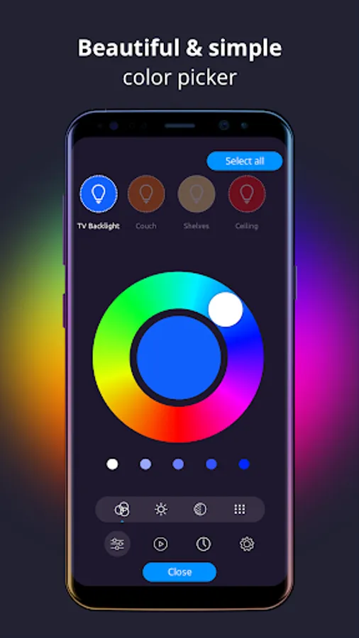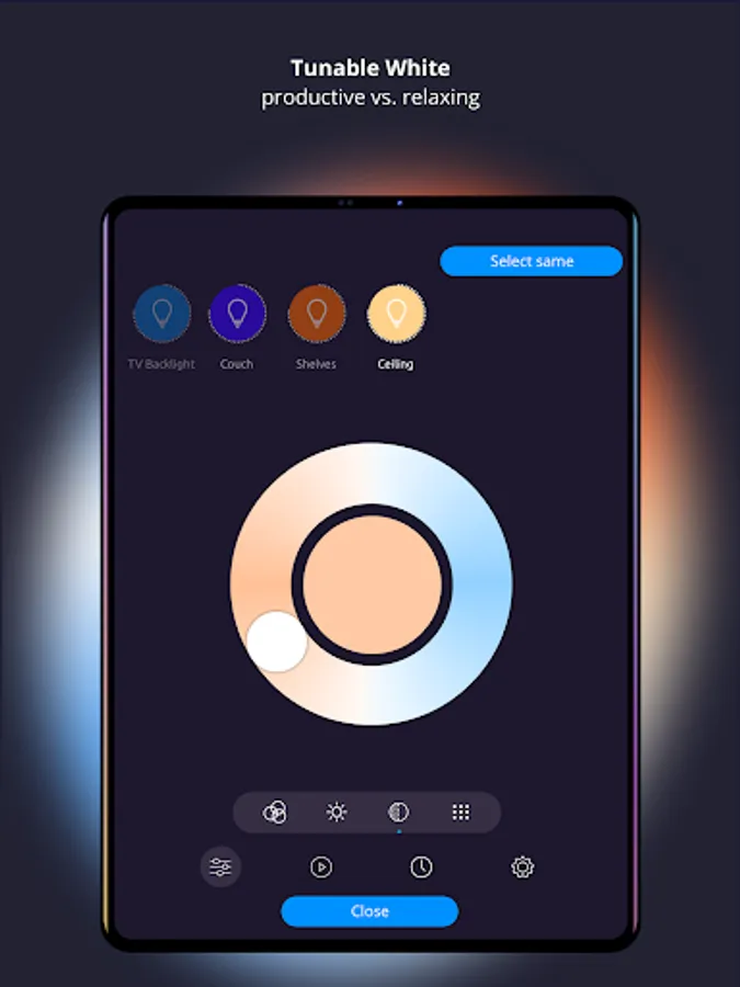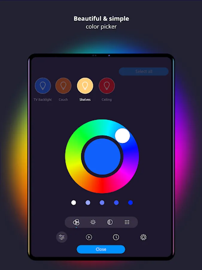 Create your own scenes like sunset or sunrise by picking and saving specific colors and brightness of your LED strips. Change the ambiance with a single tap to match your mood.