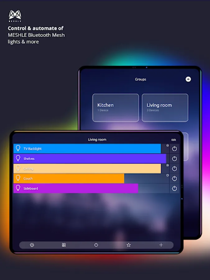 MESHLE app allows you to precisely set the hue and the brightness of one or multiple LED strips that are connected to MESHLE flex, MESHLE flex PLUS or MESHLE flex PRO Bluetooth LED Controller.