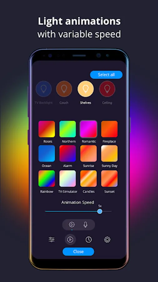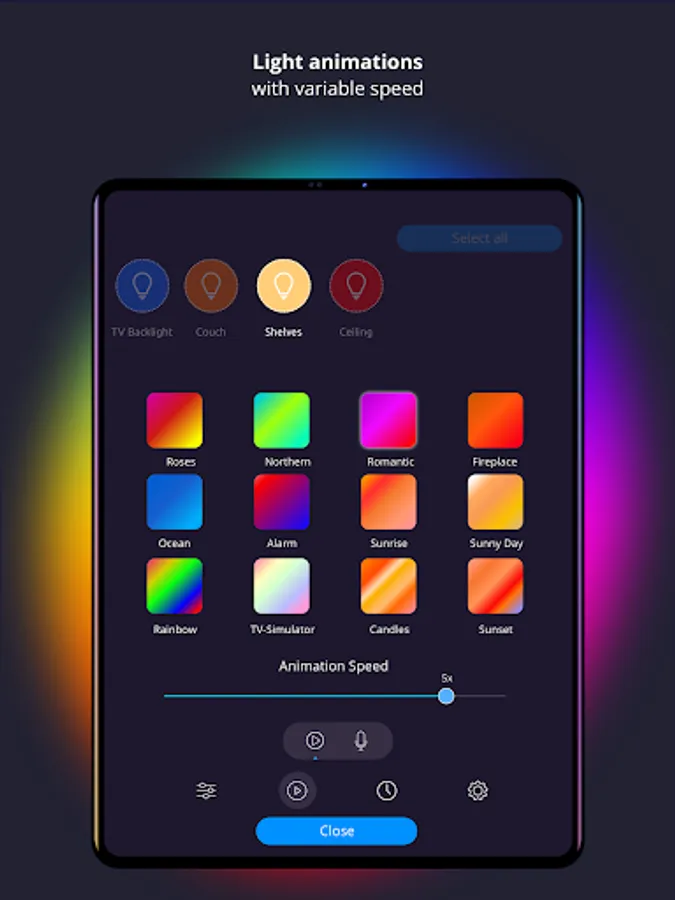 Enjoy lighting animation like ocean waves, candlelight, fire, polar lights and many more. Use TV-simulation to simulate presence at home when you are on a vacation.
