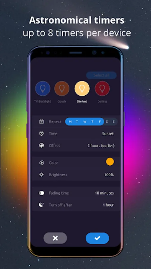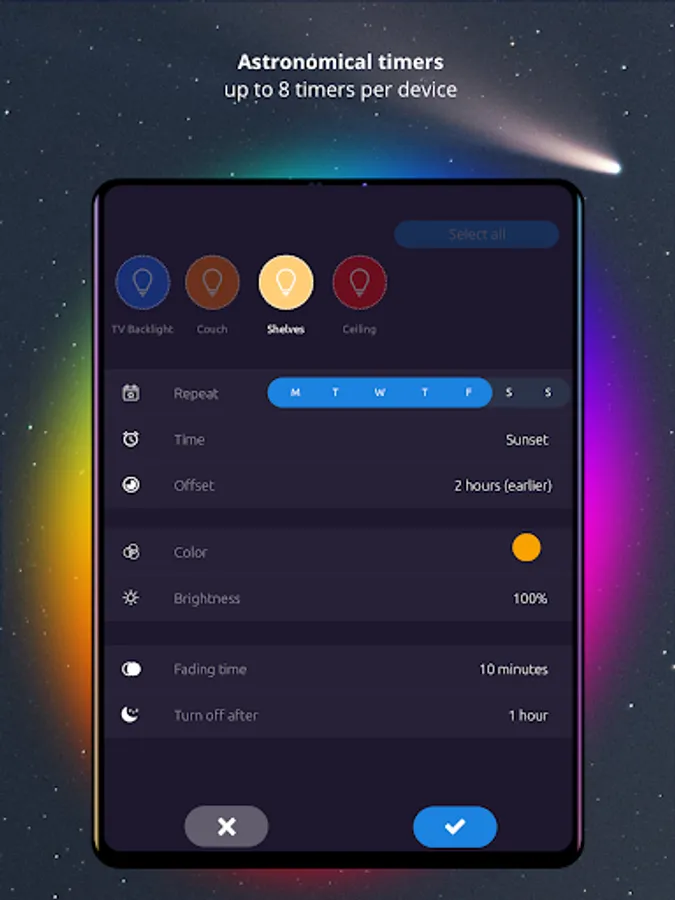 Configure the controller to enter any desired state (like on, off, specific color, animation etc.) at specified times or automatically at sunrise/ sunset based on your location. Set fade-in and fade-out time.
