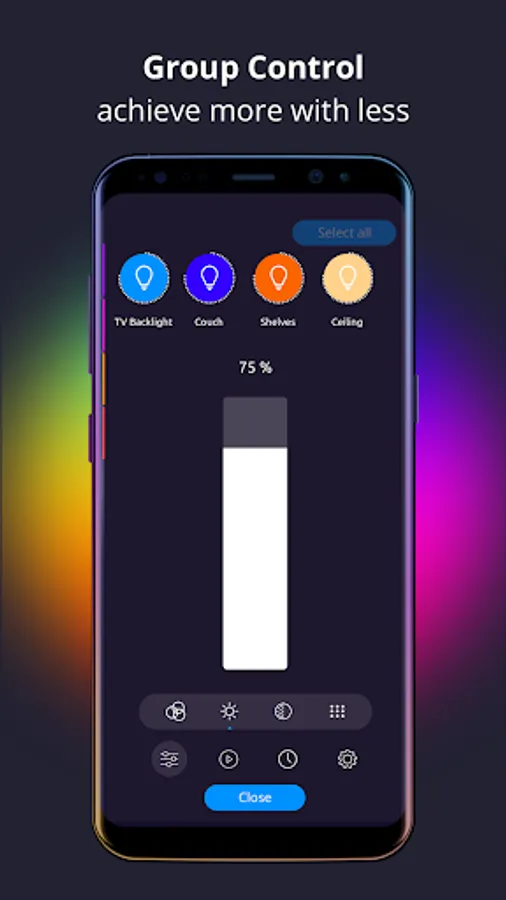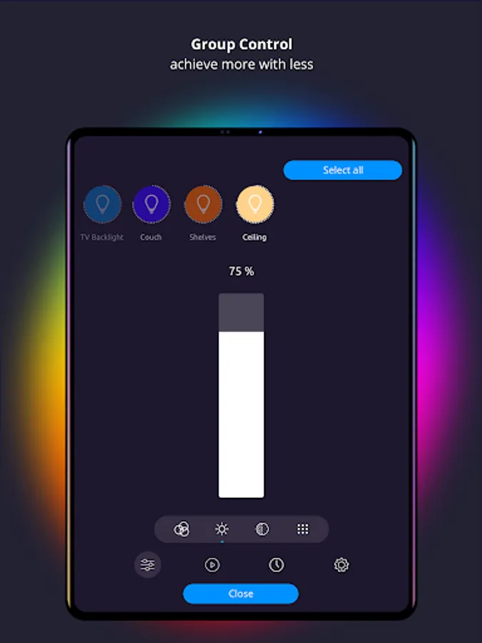 Apply light adjustments or scenes to the whole group that you have created. Control your lights simultaneously or individually.