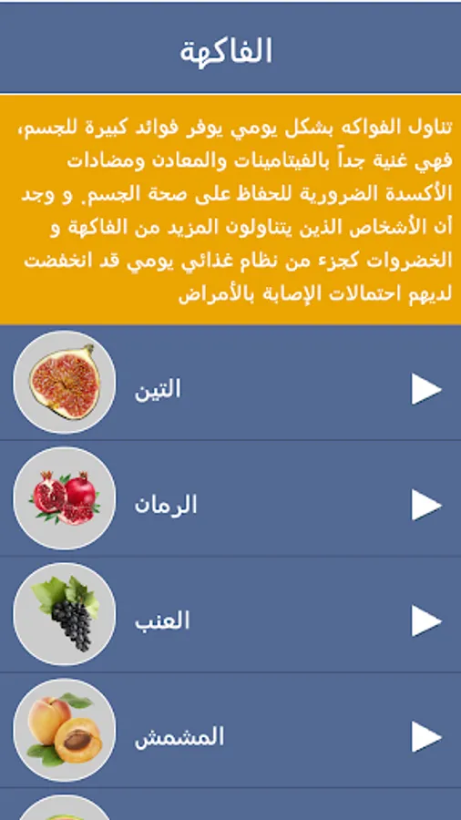 -الفاكهة، تناول الفواكه بشكل يومي يوفر فوائد كبيرة للجسم، فهي غنية جداً بالفيتامينات والمعادن ومضادات الأكسدة الضرورية للحفاظ على صحة الجسم. و وجد أن الأشخاص الذين يتناولون المزيد من الفاكهة و الخضروات كجزء من نظام غذائي يومي قد انخفضت لديهم احتمالات الإصابة بالأمراض.