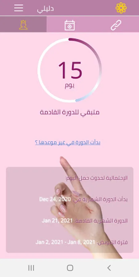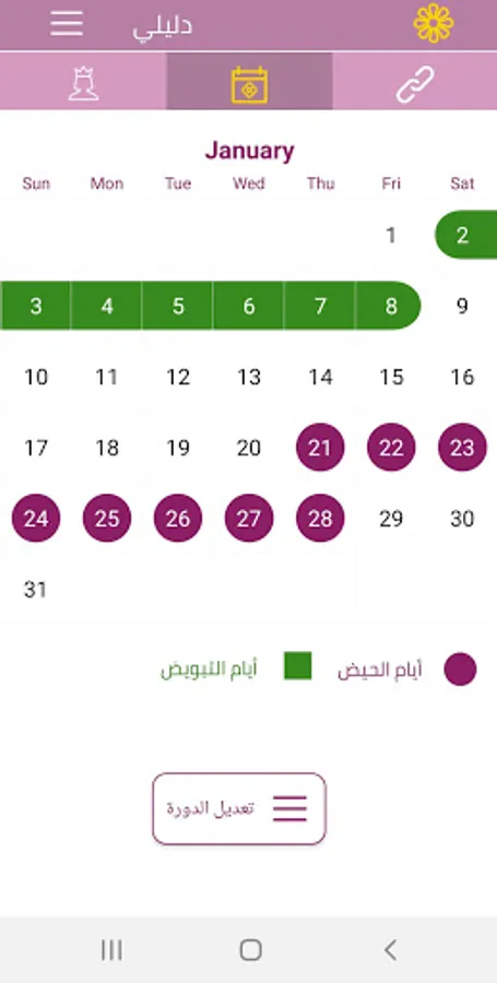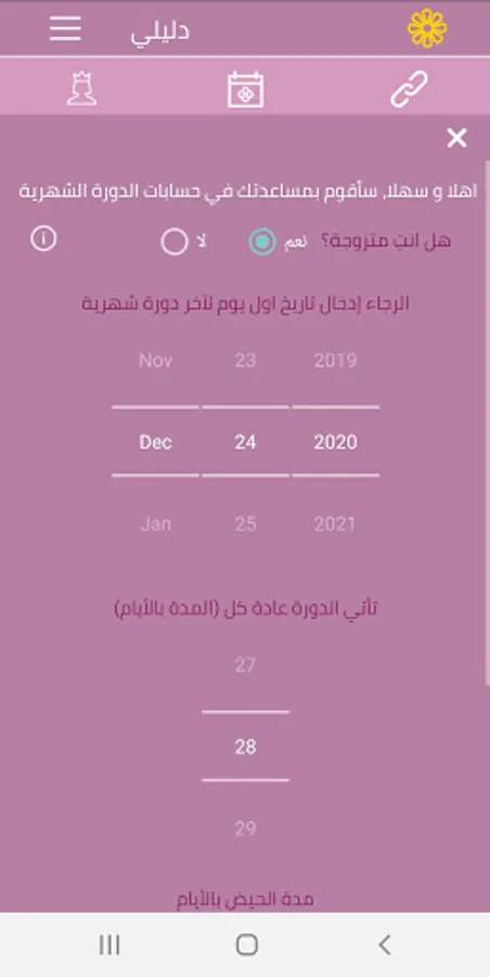 دليلي هو تطبيق جديد لحساب اوقات الدورة الشهرية الحالية والقادمة و كذلك يقوم التطبيق بحساب فترة التبويض و إحتمالية حدوث الحمل في كل يوم للمرأة المتزوجة. سيكون التطبيق دليلك و رفيقك كل يوم بالمعلومات التي يقدمها