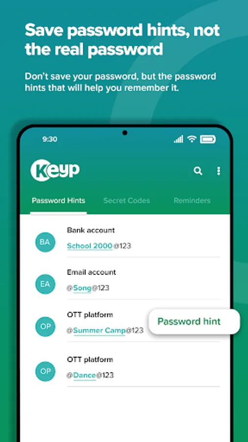 Keyp: KEYP helps you to keep password hints instead of the real password. That means, you don’t have to save the real passwords, but you will create password hints that contain secret codes and texts that only you can decode. So, the real password is safe in your mind, no other person can understand. What’s more, you can save important dates and Keyp will remind you when the expiration date nears.