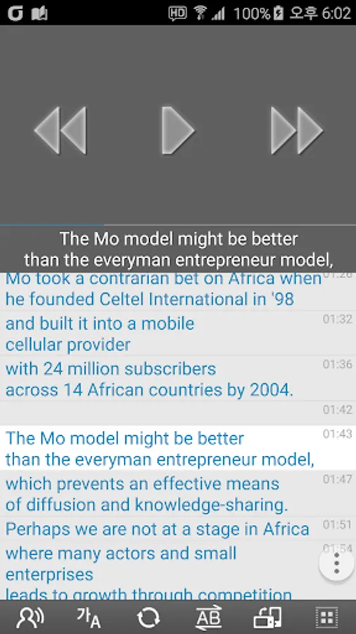 3. Scroll and find the part you want to see from the subtitle script. Playing will start from that point by touching the part.