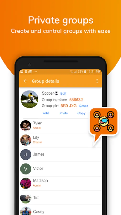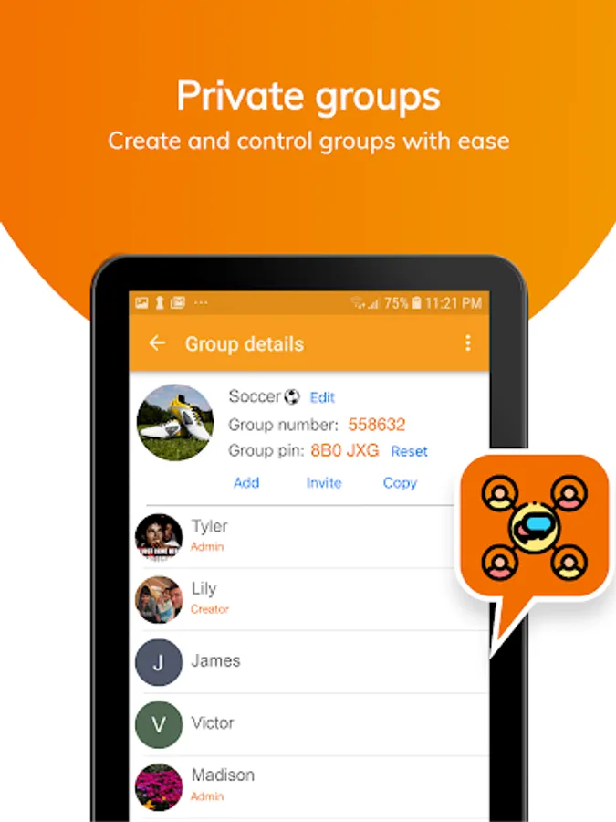 --> Private Groups: Easily create private groups. Friends can self join using group number and pin. Great for families, teams and school mates.