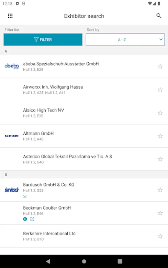 Exhibitors: search for companies and products, filter and sort functions available, also find contact persons ad exhibitor events. Add Photos and Notes to an exhibitor and share them.