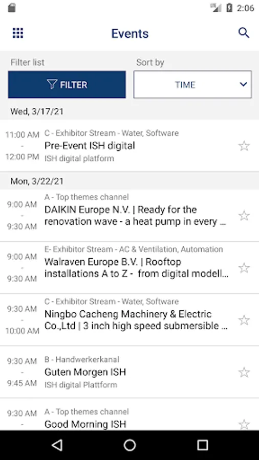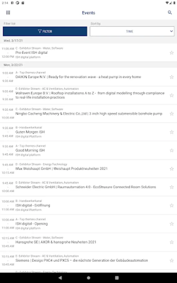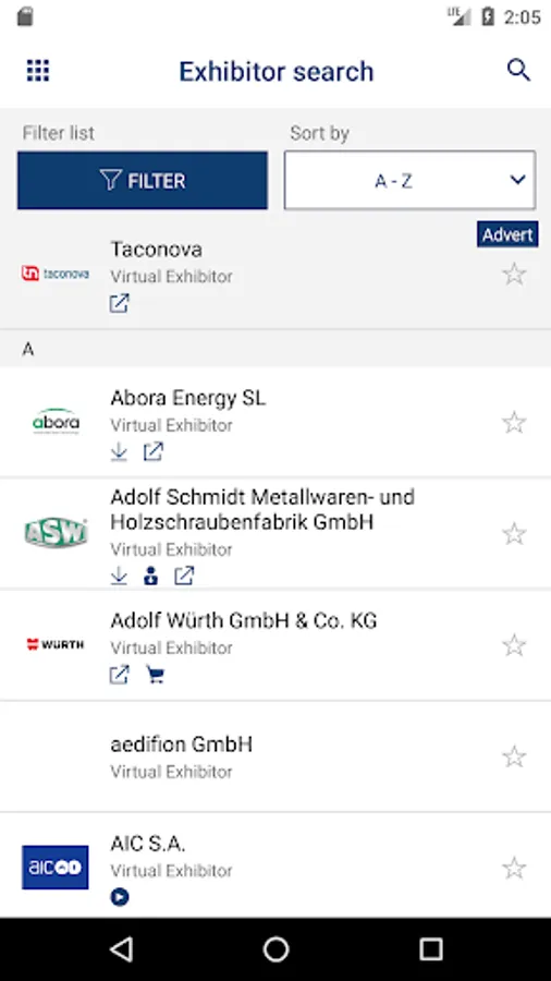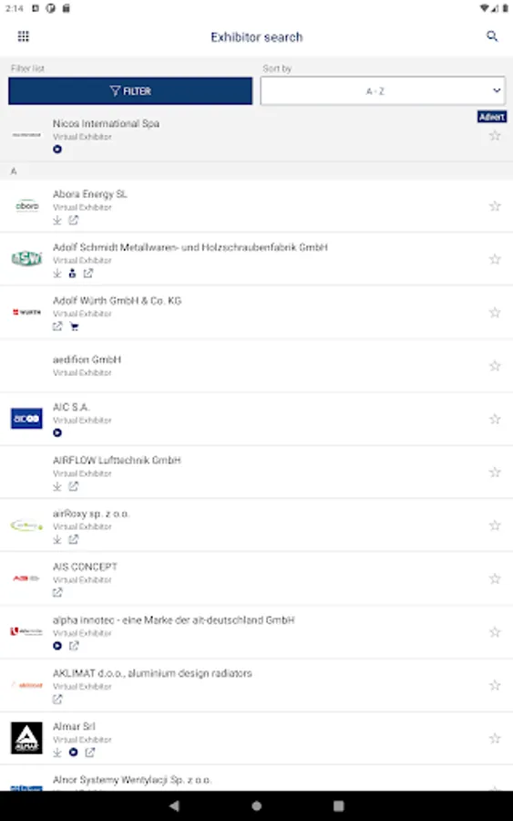Exhibitors: search for companies and products, filter and sort functions available, also find contact persons ad exhibitor events. Add Photos and Notes to an exhibitor and share them.