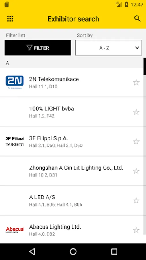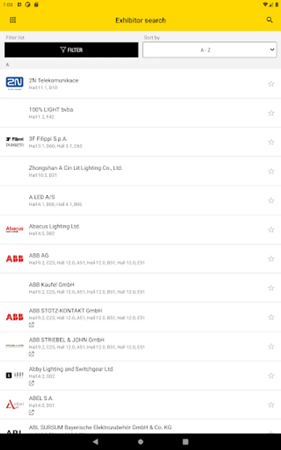 Exhibitors: search for companies and products, filter and sort functions available, also find contact persons ad exhibitor events. Add Photos and Notes to an exhibitor and share them.