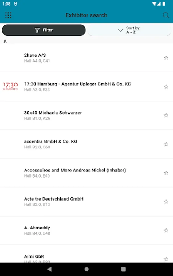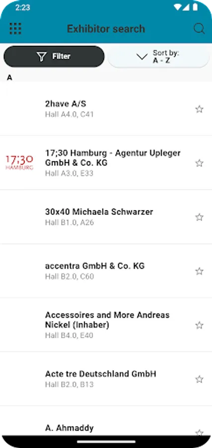 Exhibitors: search for companies and products, filter and sort functions available, also find contact persons ad exhibitor events. Add Photos and Notes to an exhibitor and share them.