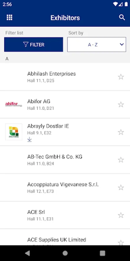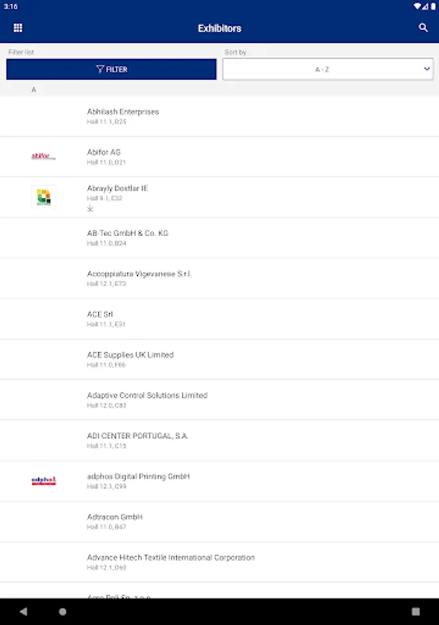 Exhibitors: search for companies and products, filter and sort functions available, also find contact persons ad exhibitor events. Add Photos and Notes to an exhibitor and share them.