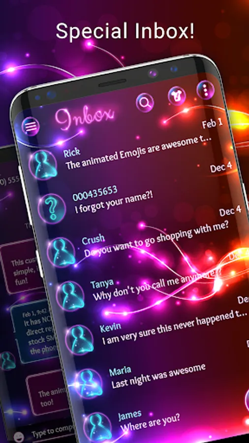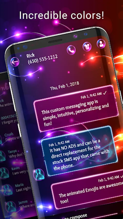 🏆 Neon lights SMS theme is the smartest choice if you want a classy device! Enjoy your Android even more with our new neon lights SMS. Don't waste your time with those boring themes and download this amazing neon lights SMS now and you will not be disappointed. Make the smart choice and get the new neon lights SMS theme right now! 🏆