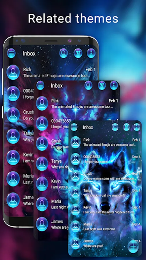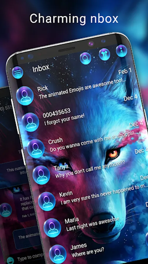 This awesome app will completely change the way you type your text messages! Discover many useful features and mix and match your SMS messenger theme and keyboard theme, all this with the help of Wolf galaxy keyboard and messages theme for SMS.