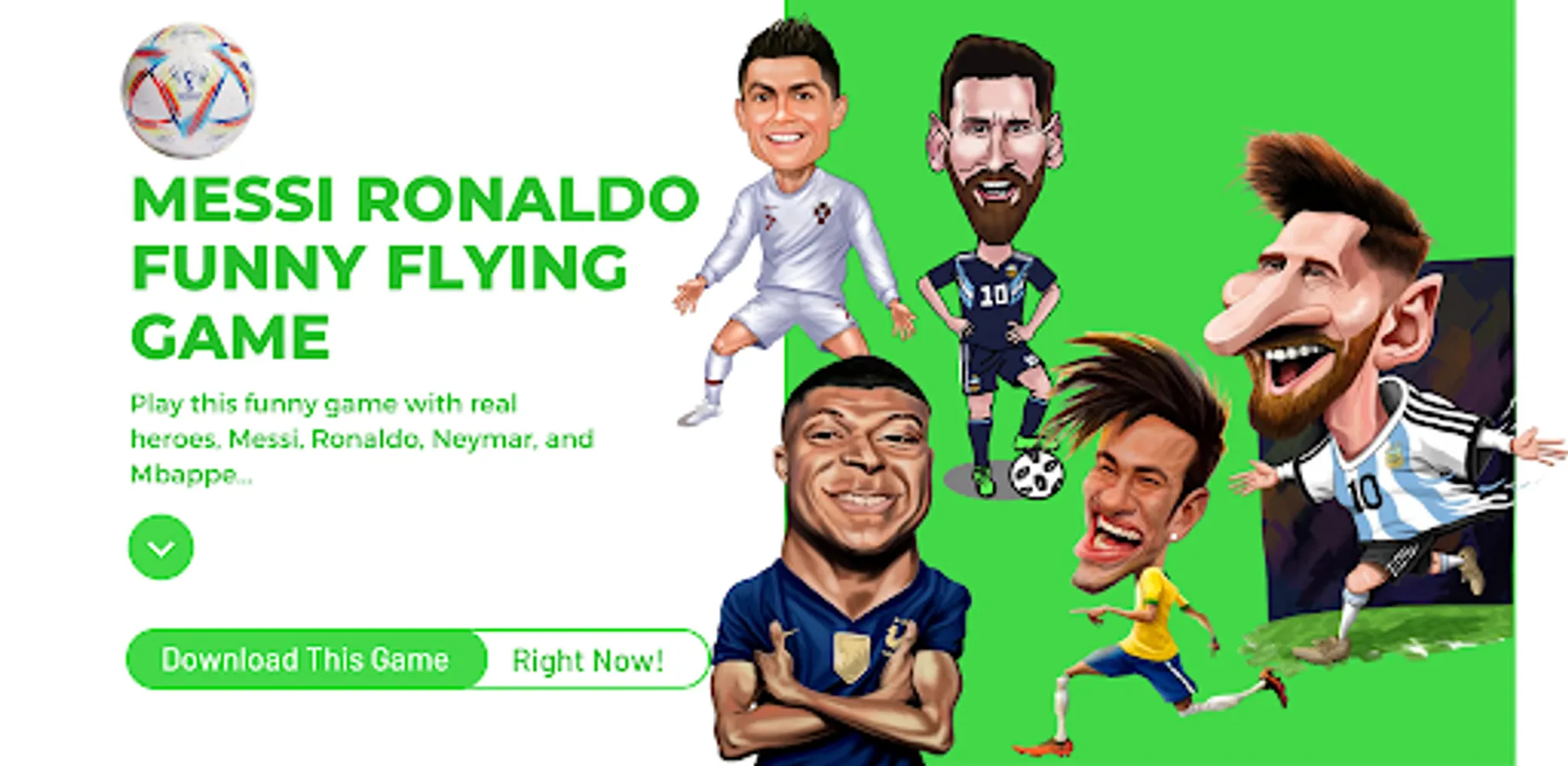 Messi Ronaldo Funny Fly is a funny casual game. In this game, you have to fly your favorite players, collect footballs, world cup, and gain points but you also need to skip the red cards and yellow cards! You can play this game with your favorite players. There are Messi (GOAT), Ronaldo (CR7), Neymar (Jr.), and Boss Indica (Mbappe)!
