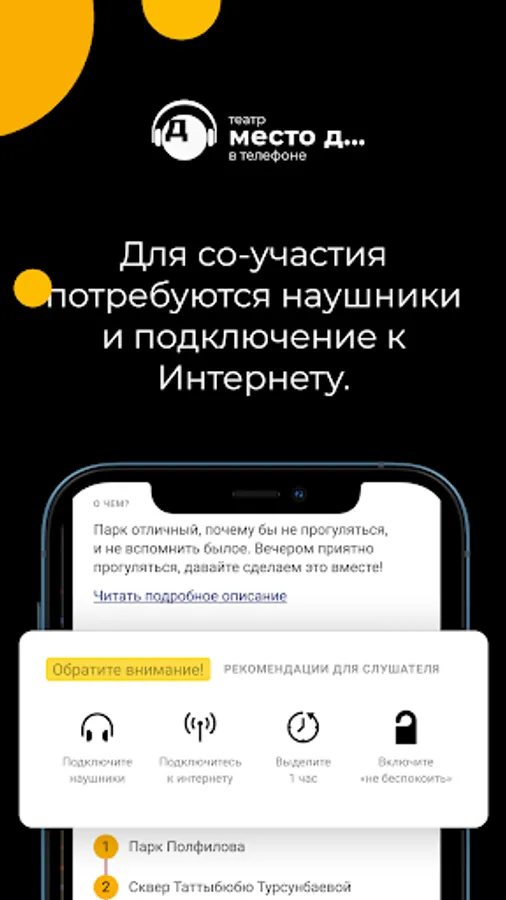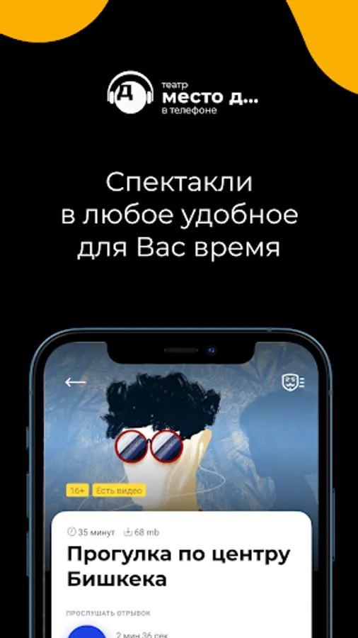 In the application you will find performances of different genres, audio tours, immersive immersions ... Theater on your phone is an opportunity to take a fresh look at familiar places and events, to dream up, to meet yourself.