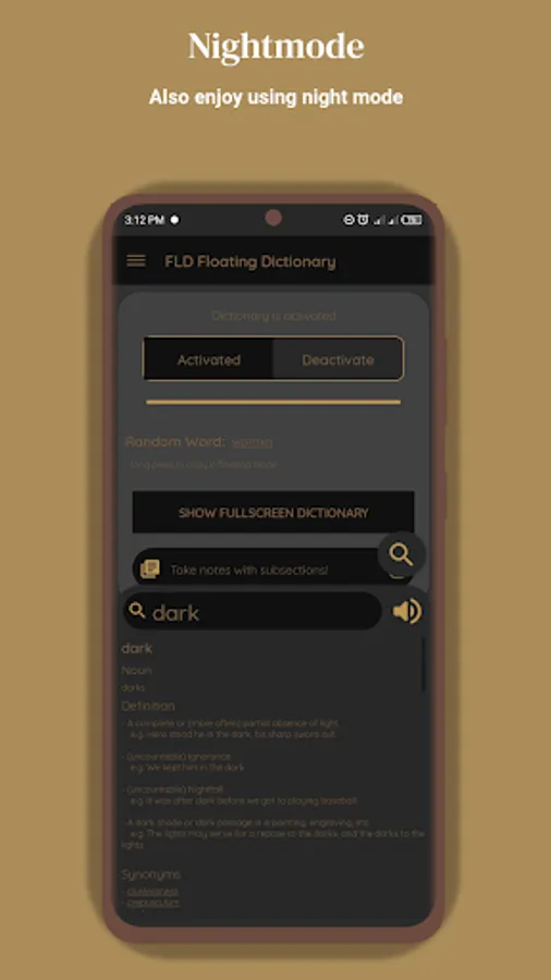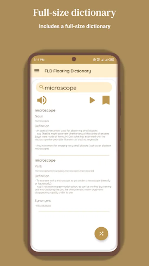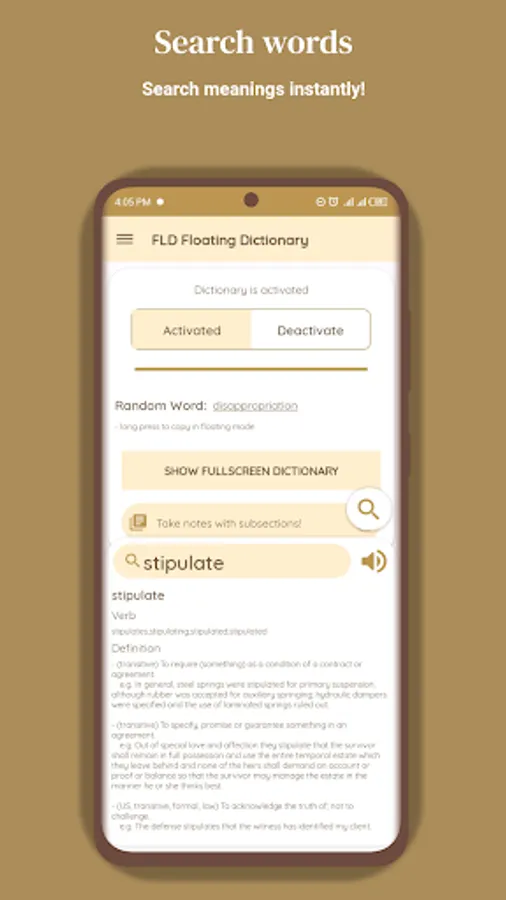 FLD Floating Dictionary is the ultimate English dictionary app that's designed to be your go-to source for all your language needs. Whether you're a student, professional, academic, native English speaker, or a non-native English speaker, FLD is the perfect tool to help you enhance your vocabulary and language skills. With FLD Floating Dictionary, you can easily look up word meanings and other attributes with just a tap on the movable floating button that stays on top of your phone screen without disrupting your current activity.