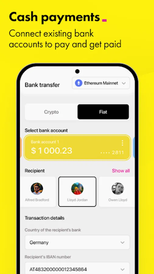 Simply add your IBAN number of your bank accounts and pay easily with our app or receive payments. Your funds stay in your bank accounts. This feature is only available in European countries, please check our country list.