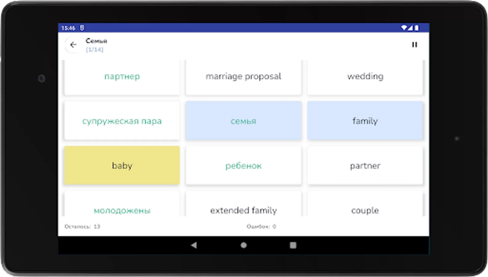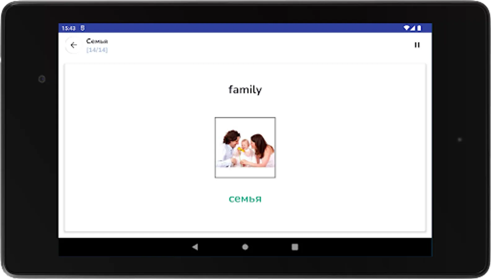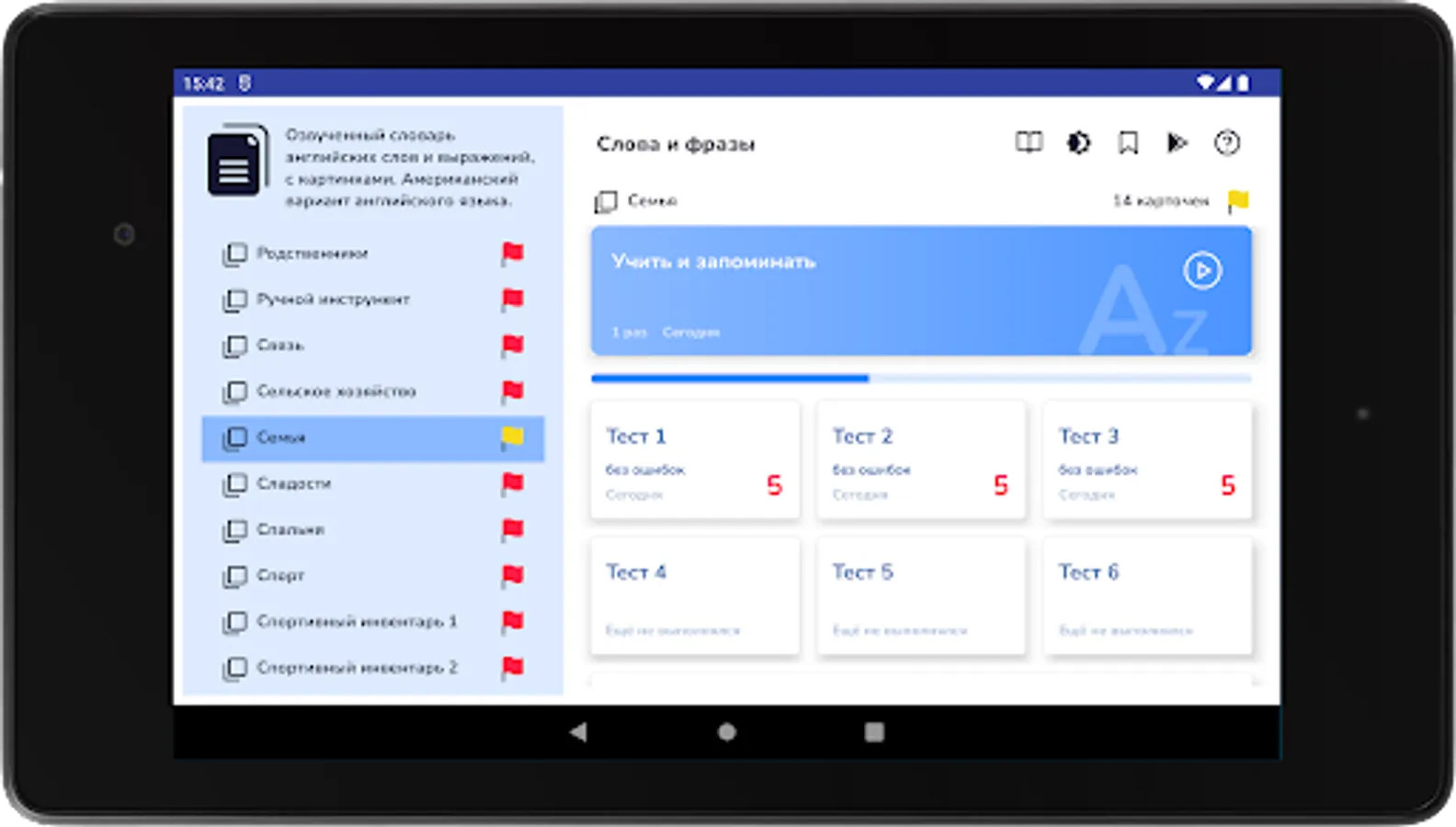 Cards with words for memorization are grouped by topic. Each topic has 10 - 15 cards. By devoting 15 minutes a day to training with the simulator, you are guaranteed to remember one topic after completing all the test exercises. By doing this, you will learn 100 English words a week - learn to read, write and perceive these words by ear.