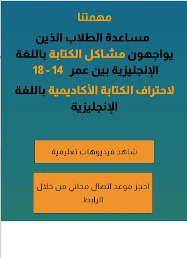 Students between the ages of 14-18 with academic writing problems in English, Tawjihi students who are striving to excel in an English language exam, and anyone who feels an urgent need to master the skill of academic writing in English
