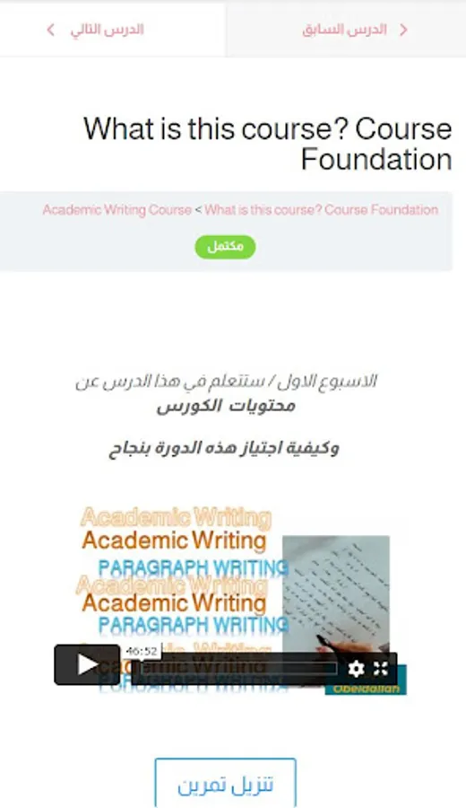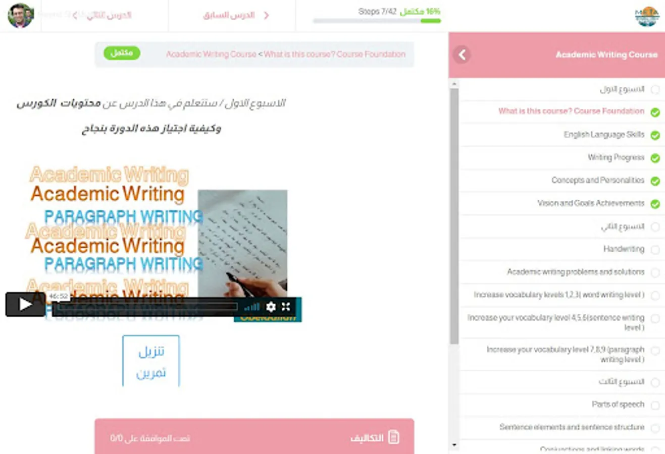 Online educational course. It aims to improve and develop the academic writing skill from word to professional article by applying and using the skills of analysis, synthesis, evaluation, critical thinking and the use of self-assessment models in the fastest and easiest way characterized by follow-up to mastery to become the legend of academic writing in the English language