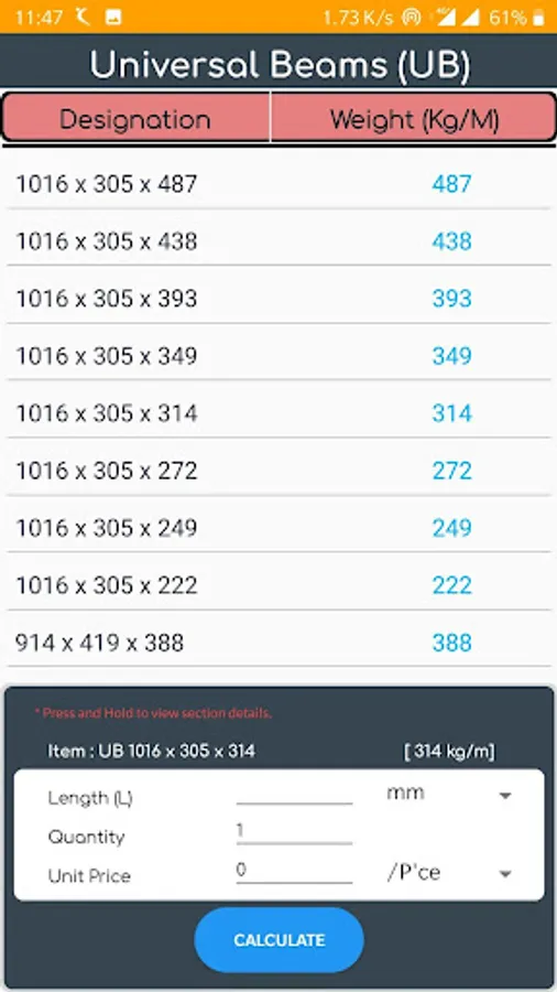 It helps you to calculate the weight & area of the any listed sections on the go.