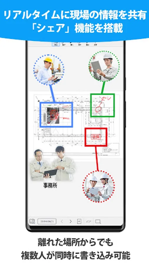 ・Multiple people can write notes at the same time even in remote locations such as the site and the office, and share site information in real time.