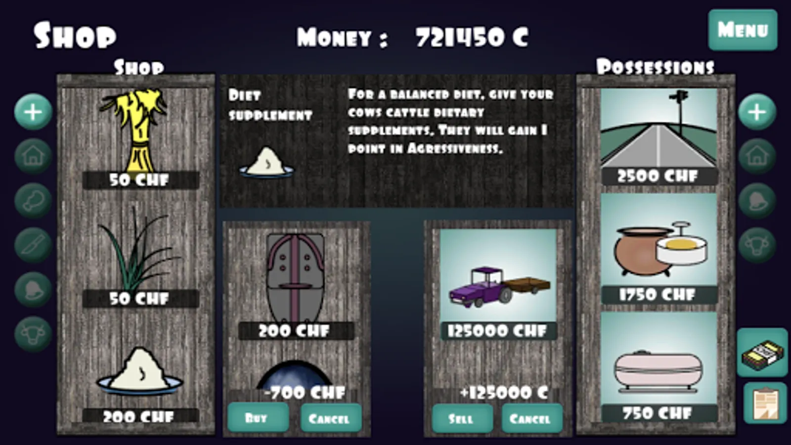 Gameplay: Buy some cows, lead them to the arena, improve your farm and become the best cow breeder the Rhône Valley has ever encountered! Confront your cows to other players' cattle, compare scores to increase your strengths and reduce your weaknesses. Take care of your fighters' health and their performance will not disappoint you. Vitality, strength, speed, aggressiveness and confidence will soon become your only goals.