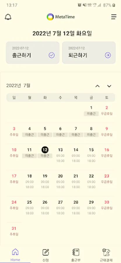 MetaTime supports 52 hours a week and various types of time and attendance-related applications, approvals, and inquiries with simple settings while complying with the Labor Standards Act.