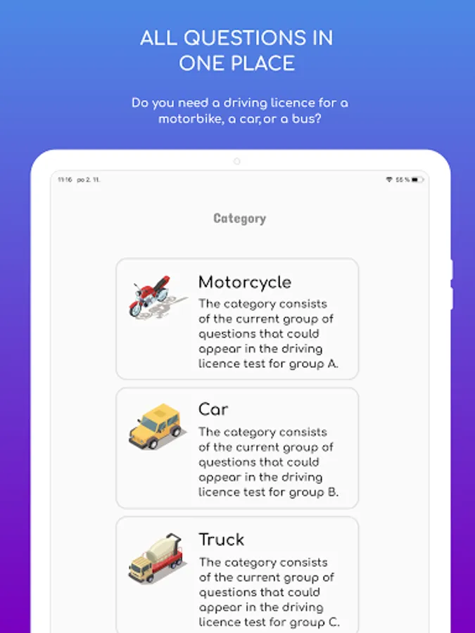 Most advanced study app to prepare for the exam in driving school. The app offers questions similar to those that you can see in driving school exams and is complemented by a massive amount of real-world driving situations.